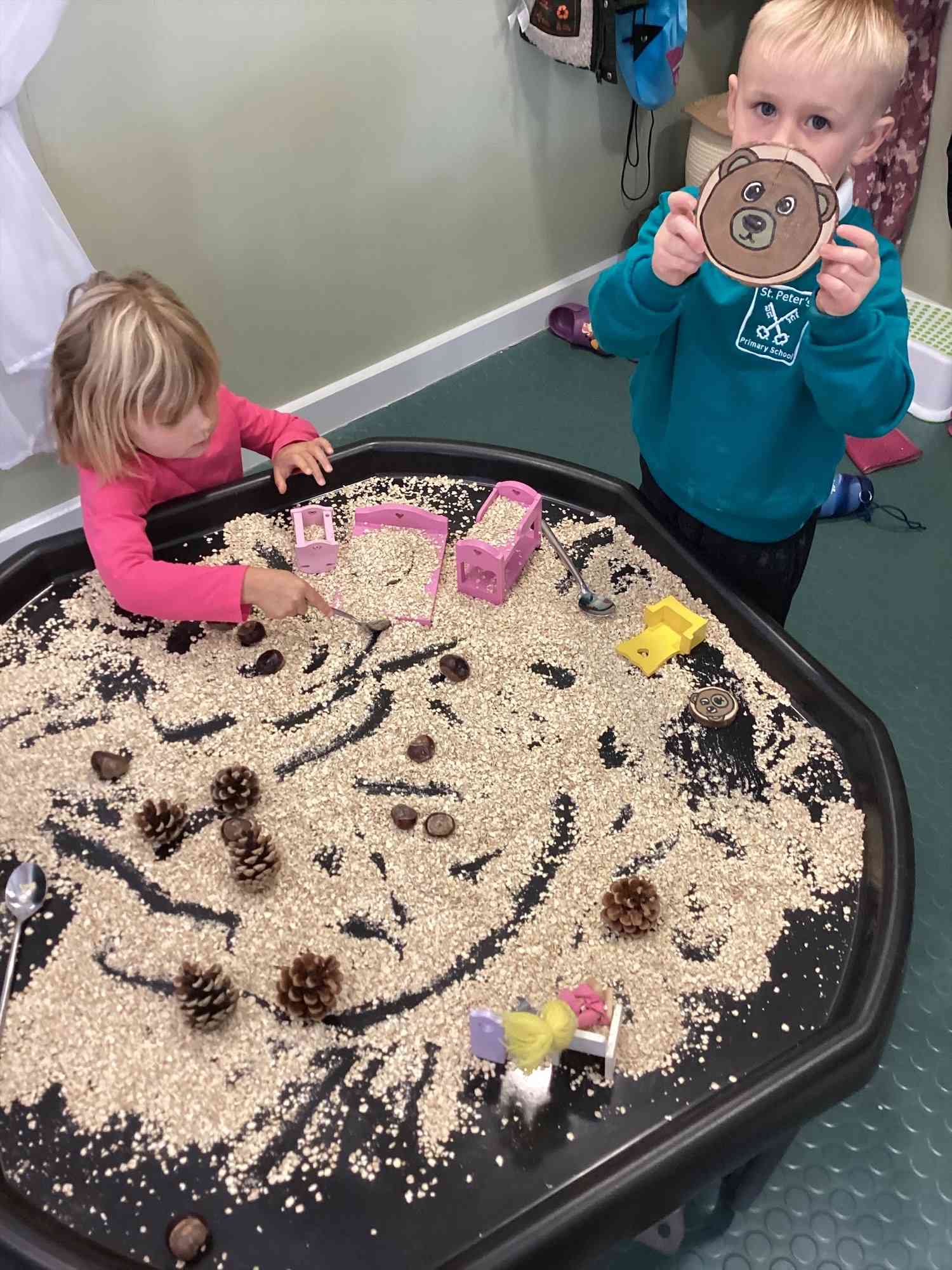 This week we have read “Goldilocks and the three bears” widening our understanding of big, medium and small. We have measured bears using cubes, enjoyed role playing in the bears cottage and tried different flavoured porridge. We discussed the importance of a healthy breakfast and sorted healthy and unhealthy foods. Baby bear got himself stuck in a tree and we all worked together, sharing ideas about how we could rescue him.